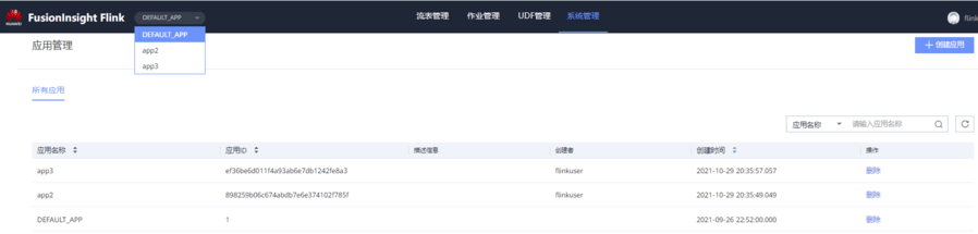 应用管理是用户区分流表、作业、UDF使用的,例如企业中有不同的部门,一个部门可以对应FlinkServer中的一个应用,不同的应用有自己的流表、作业、UDF等。具有管理员权限的用户才可以创建、删除应用。