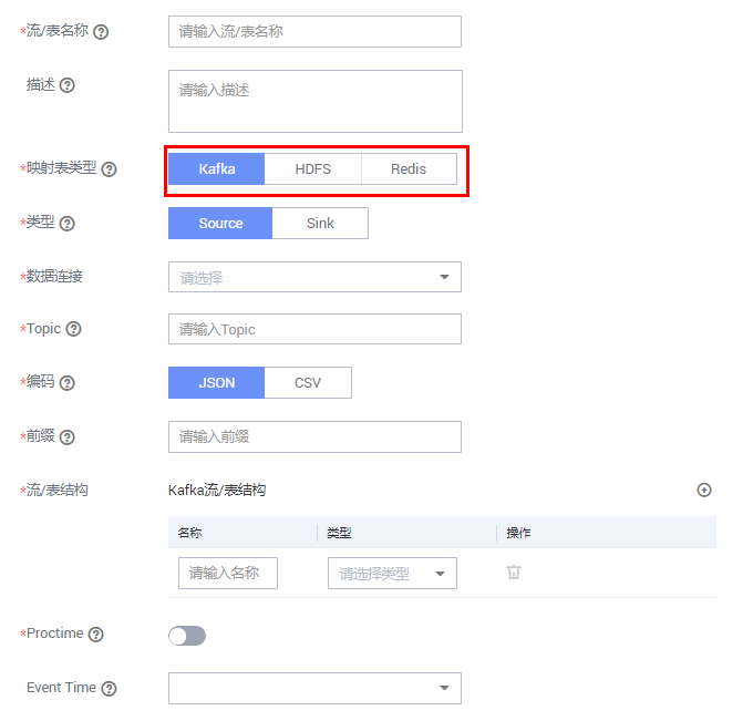 流表管理设计的初衷是为了方便业务用户定义流表,用户可以不熟悉FlinkSQL中建表语句,通过图形化界面来创建表。目前支持Kafka、HDFS、Redis三种类型的流表。创建好的流表可以在FlinkSQL作业中直接使用。