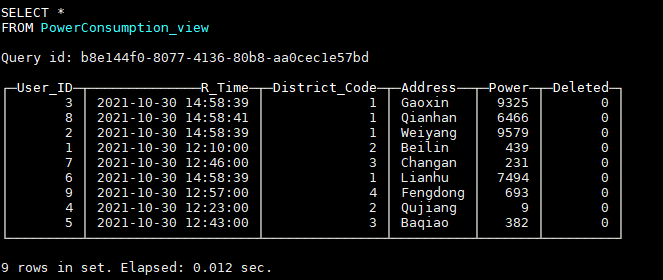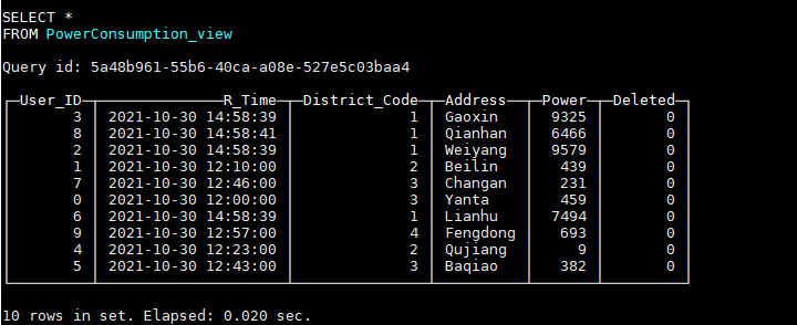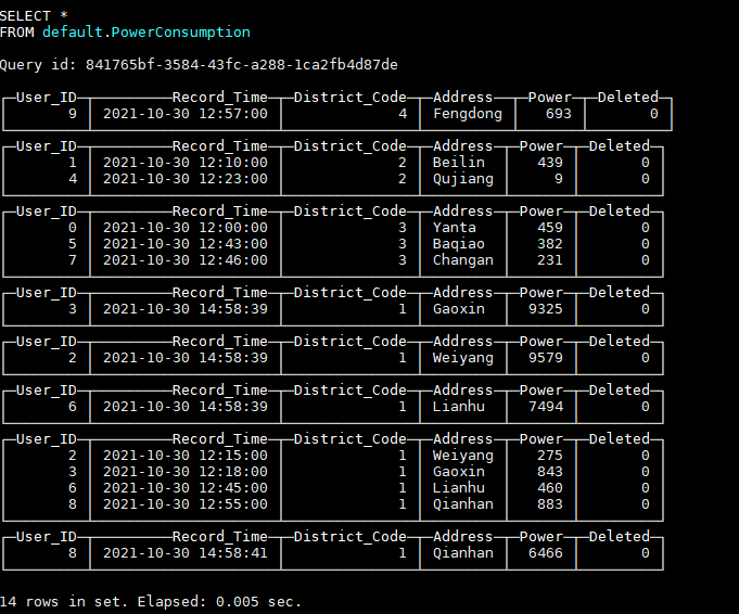PowerConsumption_local为本地表,PowerConsumption为对应的分布式表。其中PowerConsumption_local使用ReplicatedReplacingMergeTree表引擎,第三个参数‘Record_Time’表示相同主键的多条数据,只会保留Record_Time最大的一条,我们正是利用ReplacingMergeTree的这一特性来实现数据的更新删除。因此,在选择主键时,我们需要确保主键唯一。这里我们选择(User_ID, Address)来作为主键,因为用户ID加上用户的地址可以确定唯一的一个电表,不会出现第二个相同的电表,所以对于某个电表多条数据,只会保留电量记录时间最新的一条。