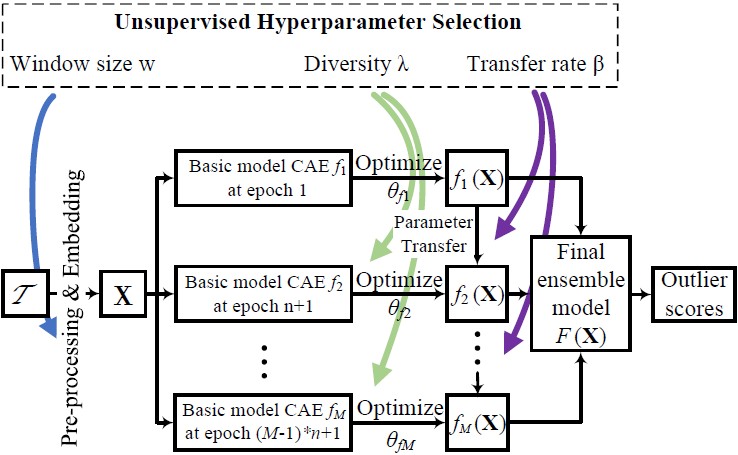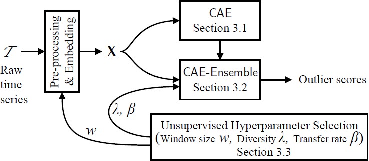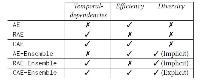 - 提出了CAE-ENSEMBLE算法,本算法包括基于CNN的自编码器和多样性驱动的集成学习方法,其中基于CNN的自编码器用于对时间序列的时间依赖进行高效建模,多样性驱动的集成学习方法进一步提升了算法的准确性。