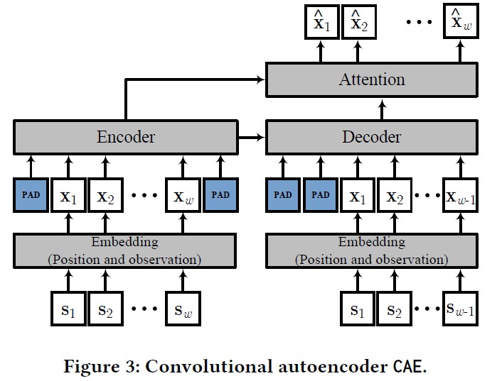 本文采用基于CNN的自动编码器CAE作为集成学习的基础模型,并对时间序列进行建模,CAE结合了卷积神经网络CNN与Seq2Seq模型,结构如下图所示。首先,我们将一个滑动窗口的时间序列数据输入到由一维卷积组成的编码器中学习数据的时间依赖,然后将同样的数据和编码器学到的隐藏表示一起输入到由一维卷积组成的解码器中进行特征学习,最后利用注意力机制组合编码器和解码器学习到的特征,并用于重构时间序列。