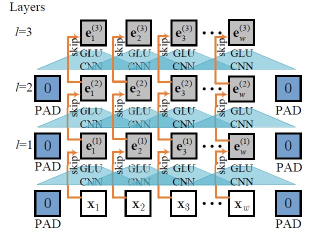 在编码阶段,编码器采用堆叠的卷积层学习时间序列的时序特征,下图给出了一个由三层卷积网络组成的编码器示例。