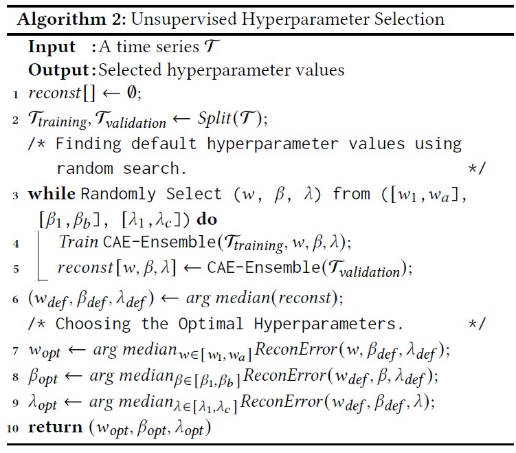 ,由于我们的方法是无监督的,首先,我们将划分无标签的训练集和验证集,然后我们为这三个参数设定一个范围,然后利用随机搜索,通过最小化重构损失确定一个最优的超参组合,,其中利用重构损失可以使得我们的算法不需要标签,达到无监督的作用。同时,在寻找某个参数的最优值的过程中,我们会将另外两个参数固定在默认值。具体算法如下图所示。