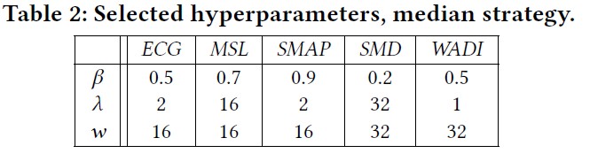 本文选择了五个常见的公开数据集ECG、SMD、MSL、SMAP、WADI,并选取了10个baseline与本文提出的CAE-ENSEMBEL算法比较。根据上述的无监督超参选择方法,对不同数据集设定的超参设置如下。