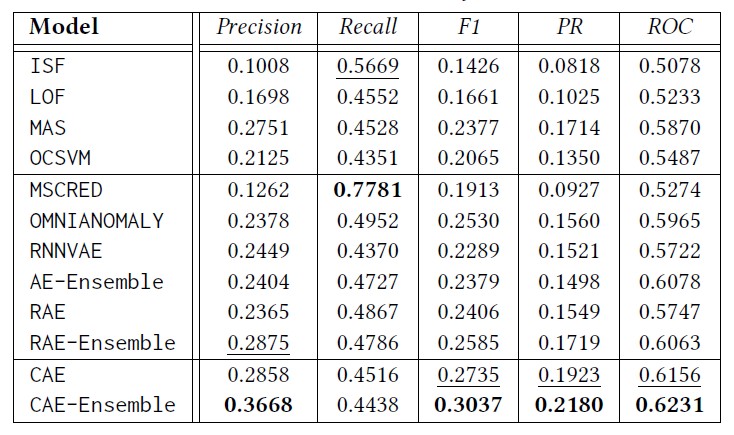 - CAE-ENSEMBLE算法的表现在真实的时间序列数据集上击败了现有的方法。