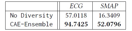 同时,我们去除了模型的多样性部分,并与完整的模型进行对比,发现CAE-Ensemble模型在多样性方面远远超过去除多样性的模型。