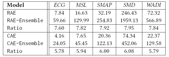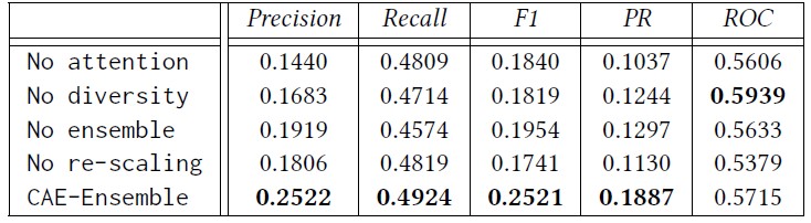 实验结果 我们在五个数据集上分别做了对比实验,用Precision、Recall、F1、PR和ROC作为评价手段,总体的精度结果如下图,可以发现CAE-Ensemble的结果在大部分情况下优于baselines。