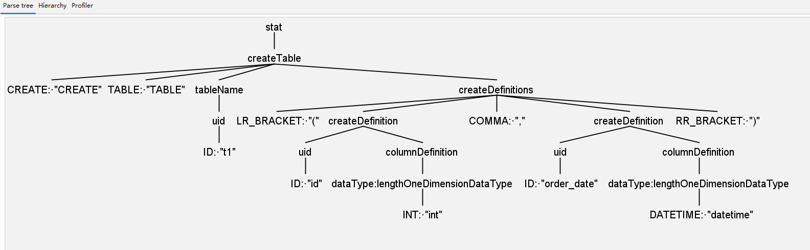 CharStream input = CharStreams.fromString("CREATE TABLE t1 (id integer, order_date datetime);");