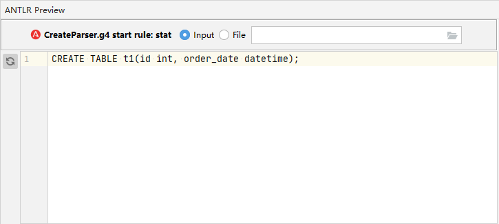 文法规则文件stat规则处,右键选择"Test rule stat",打开ANTLR Preview调试界面,输出示例建表语句,如下图。