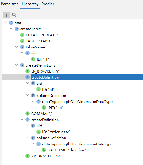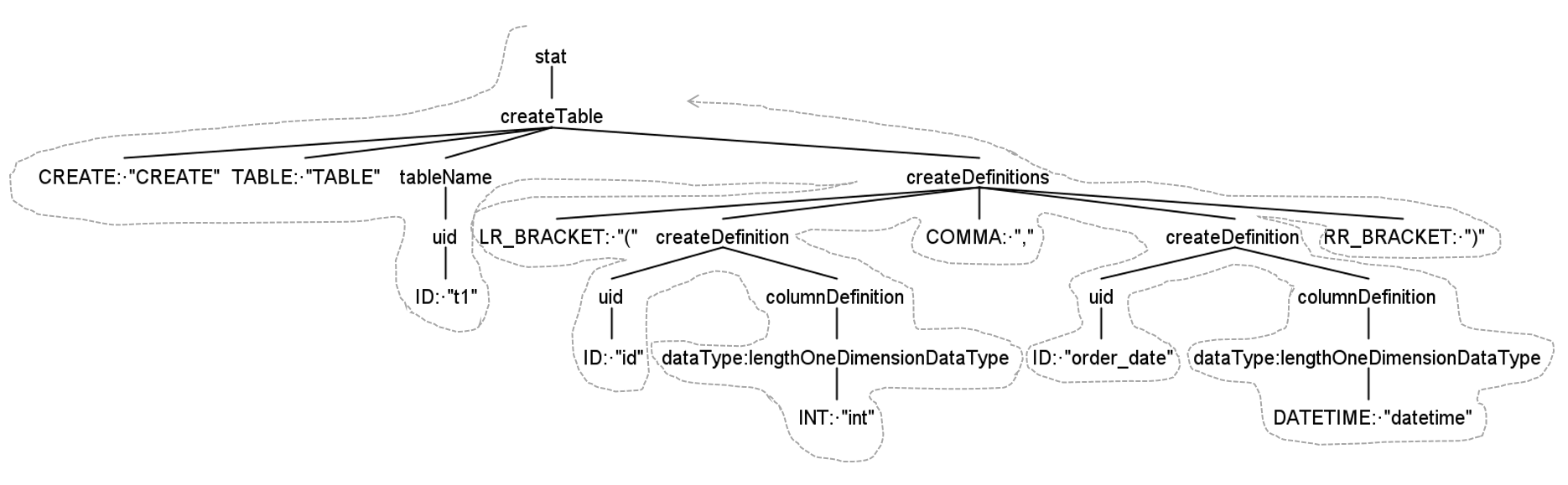 右侧自动生成对应的Parse Tree,可以直观显示解析结构,其中,叶子节点为词法终结符,通常为SQL关键字或者变量标识符;非叶子节点为文法非终结符,通常为文法规则.