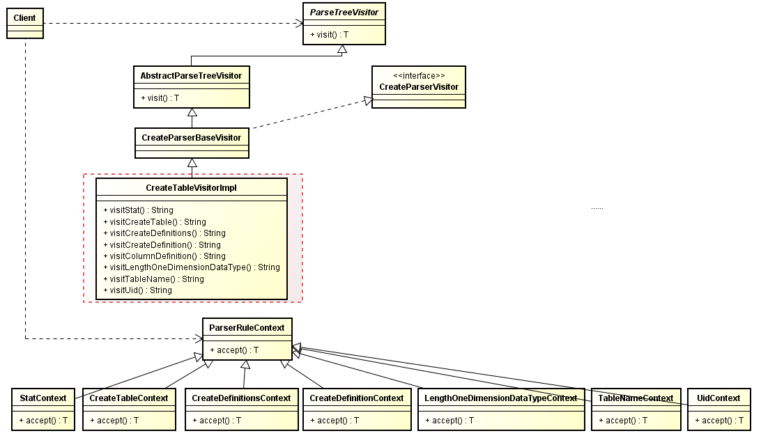 至此,实现方法很显而易见。开发只需要基于抽象类 CreateParserBaseVisitor实现即可(如类图中红色框出部分 CreateParserBaseVisitor ),并按需重写抽象类生成的抽象接口。从访问路线看,需要依次重写实现遍历Parse Tree的过程所到之处的node对应的visit函数,即可达到转换的目的。