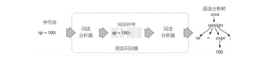 以赋值表达式 sp=100;为例,下图(来源于官方手册文档)展示Antlr语法分析器根据字符串自动生成语法解析树的过程。Parse Tree的叶子节点是输入的词法符号,比如,关键字,变量标识符等等。句子,即是符号的线性组合,本质上是语法分析树在人脑中的串行化。