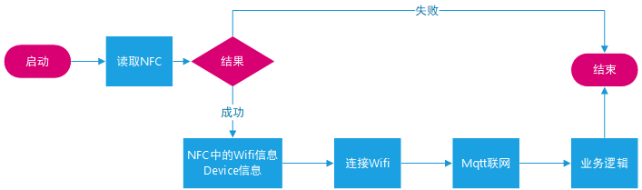 2、开发板启动时,先读取NFC内容,按照预定的格式,如果发现了以上写入信息,就直接使用来连接Wifi和物联网。