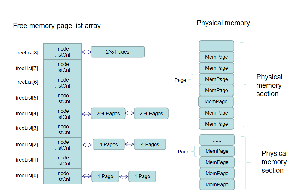 从上文的介绍,我们知道物理内存段包含一个空闲内存页节点链表数组,数组大小为9。数组中的每个链表上的内存页节点的大小等于2的幂次方个内存页,例如:第0个链表上挂载的空闲内存节点的大小为2的0次方个内存页,即1个内存页;第8个链表上挂载的内存页节点的大小为2的8次方个内存页,即256个内存页。相同大小的内存块挂在同一个链表上进行管理。