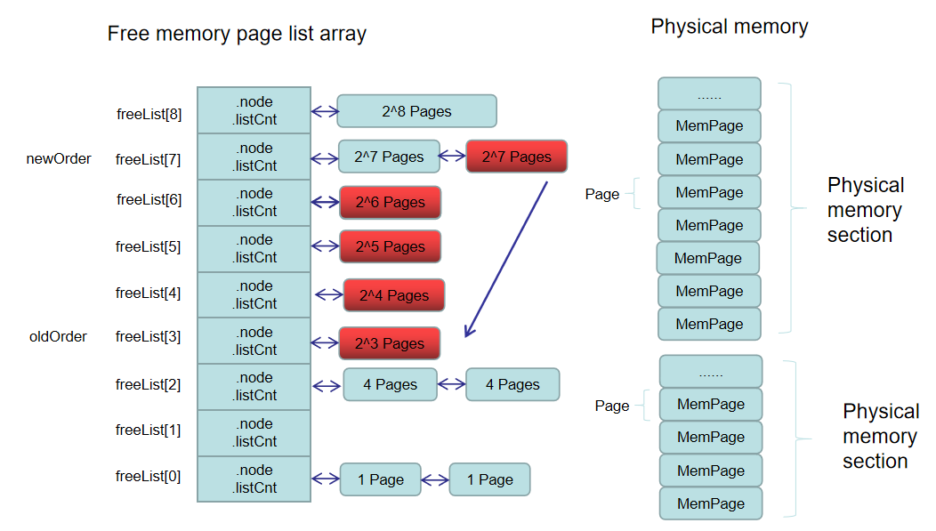 这里有必要放这一张图,直观演示一下。假如我们需要申请8个内存页大小的内存节点,但是只有freeList[7]链表上才有空闲节点。申请成功后,超过了应用需要的大小,需要进行拆分。把2^7个内存页分为2份大小为2^6个内存页的节点,第一份继续拆分,第二份挂载到freeList[6]链表上。然后把第一份2^6个内存页拆分为2个2^5个内存页节点,第一份继续拆分,第二份挂载到freeList[5]链表上。依次进行下去,最后拆分为2份2^3个内存页大小的内存页节点,第一份作为实际申请的内存页返回,第二份挂载到freeList[3]链表上。如下图红色部分所示。