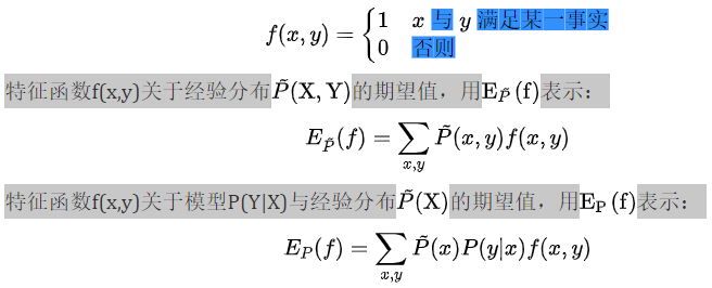 用特征函数f(x,y)描述输入x和输出y之间的某一个事实。其定义是