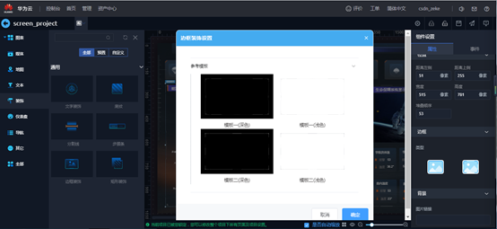 可以用来设置边框的样式,右侧组件设置,属性标签可以设置背景、颜色、样式等内容。组件右键“高级设置”可以选择参考模板。