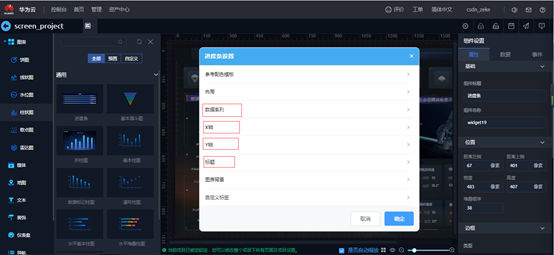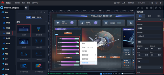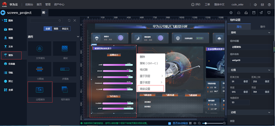 用来显示进度组件,右侧组件设置,属性标签可以设置位置,边框,背景,特性等内容;数据标签可以配置数据源,静态数据等内容。组件右键“高级设置”可以设置标题,XY轴,数据系列等内容。