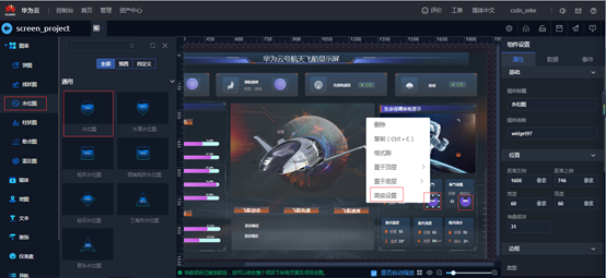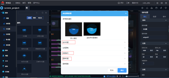 用来显示水位效果的百分比图形,右侧组件设置,属性标签可以设置模板,标题,边框圆角,数据系列等内容;数据标签可以配置数据源为静态数据等内容。组件右键“高级设置”可以设置模板,背景颜色,阴影,边框等内容。