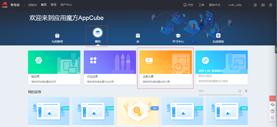 这里就进入了开发环境,在“项目”里可以看到有轻应用、行业应用、业务大屏等开发,也可以去“学习中心”去学习提供的一些案例知识。