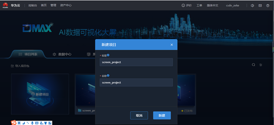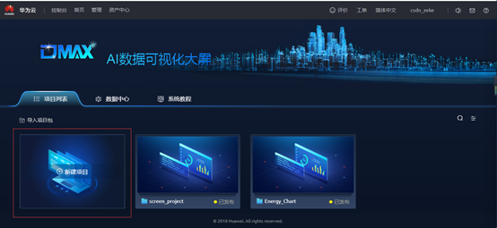 点击“业务大屏”,进入后就可以进行创建项目,也可以打开原有开发好的项目。还可以在“系统教程”里面学习提供的案例开发。