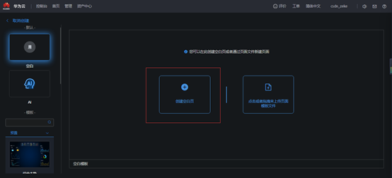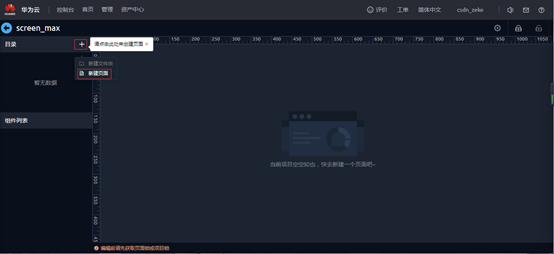 点击左侧“+”,点击“新建页面”,可以“选择创建空白页”创建;也可以使用AI,通过一个绘制的大屏设计图自动识别创建;还可以选择预置的模板进行创建。