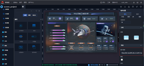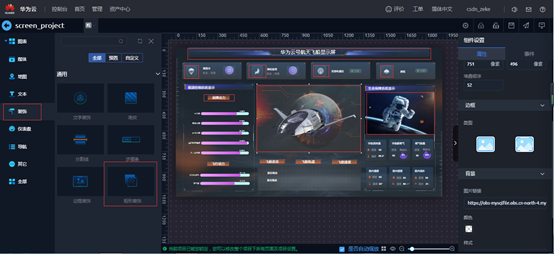 一个好的大屏设计,更多的需要好的图片素材和颜色搭配,本次用到的图片素材比较多,拖入矩形装饰,文字装饰,边框装饰,发现设置背景的图片链接,只能使用网络链接地址,不支持本地上传图片,只有页面的背景支持本地上传。