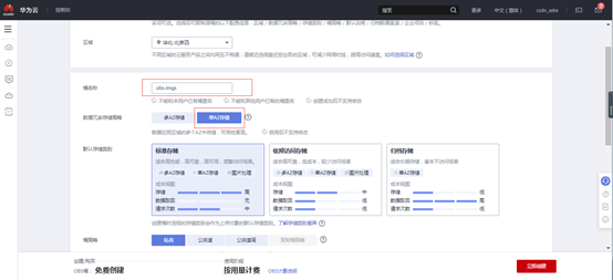 点击“创建桶”,填写桶名称,选择单AZ存储,点击“立即创建”