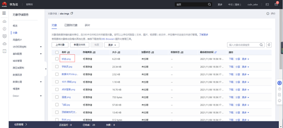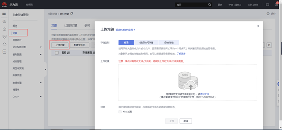 桶列表里面点击创建好的桶名称“obs-imgs”,打开以后点击左侧“对象”,然后点击“上传对象”。