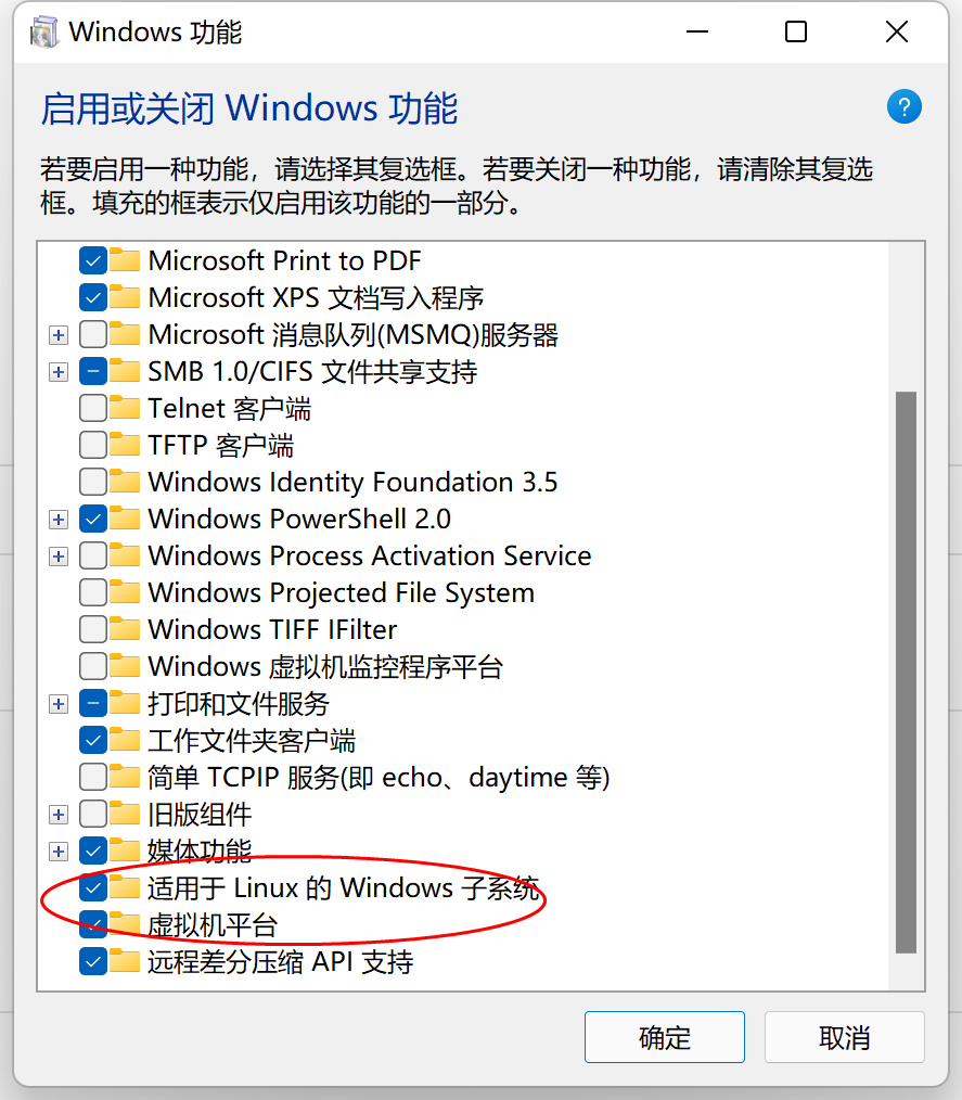 WSL1需要选择“适用于Linux的Windows子系统”,如果要支持WSL2则再选择“虚拟机平台”