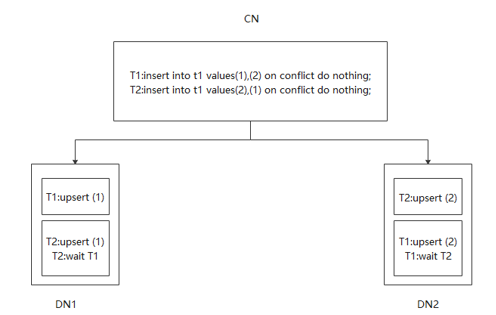 当T1向DN1中插入了数据1,T2向DN2中插入了数据2时,若T1向DN2中插入数据2,需要等T1事务结束,此时当T2向DN1插入数据1时,要等T1事务结束,因此发生分布式死锁。