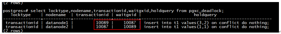 该类死锁场景,在PG上也同样存在,属于已知场景,若发生在单节点上会被检测到并解锁,但若发生在多节点上便会产生分布式死锁,由于目前GaussDB没有分布式死锁自动检测并解锁的工具,因此会影响业务性能。若存在该业务场景且发现插入性能明显变差时,可通过pgxc_deadlock视图检测是否出现分布式死锁,如下图:
