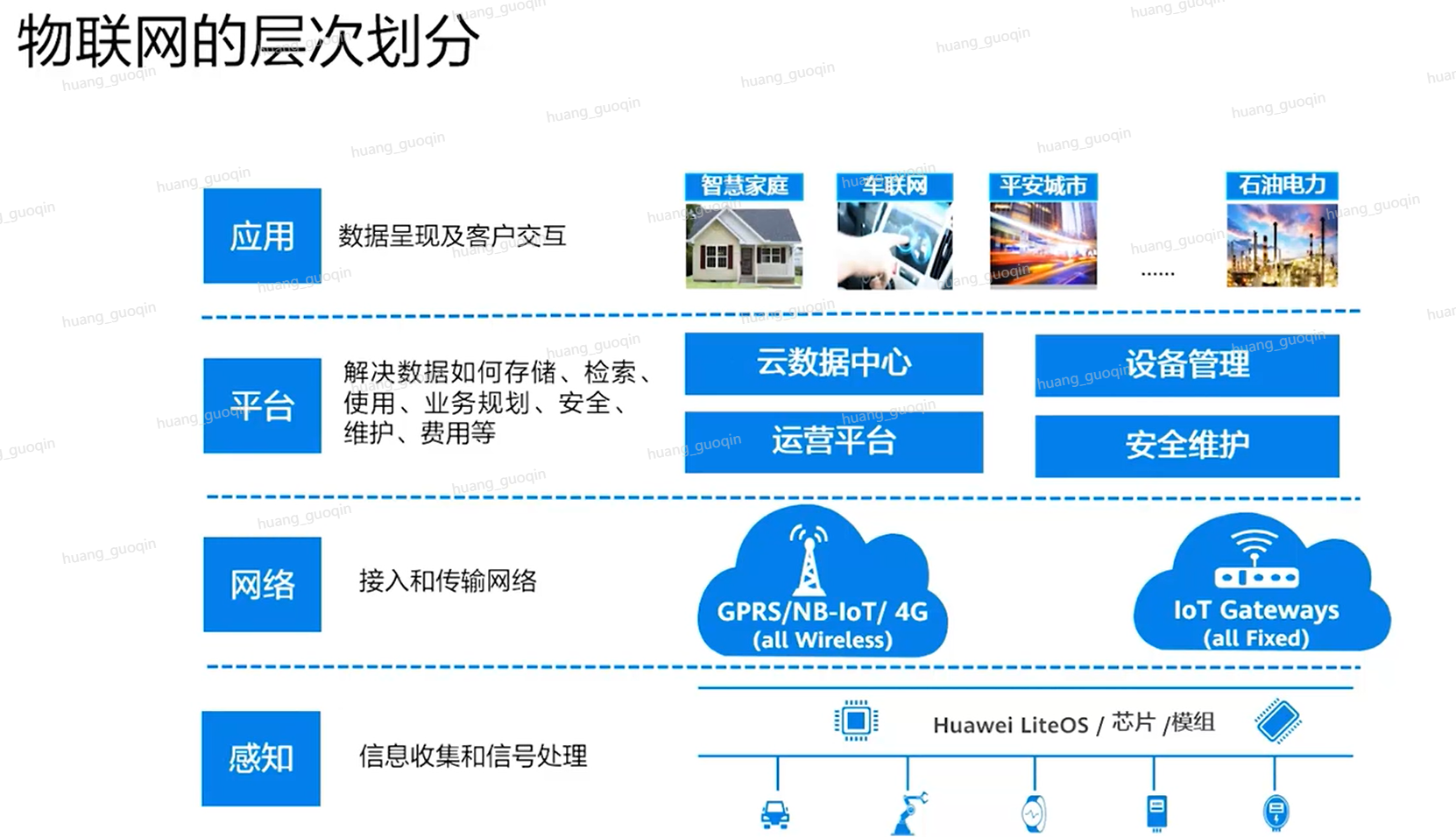 从互联网出现以后,人跟人之间的联系就变得更加密切了,可谓天涯若比邻。而物联网则是将所有的物都联系在一起。在信息技术爆炸式发展的今天,互联网承载着这些数据信息,帮助其流通。所以物联网也是一项为数据服务的技术,为了构建这么一个物与物相连的互联网,物联网设备就需要做到足够聪明,去了解使用者的需求,以此来为人类提供更多智能的服务。本节的第二个内容,将介绍物联网的整体架构。物联网的整体架构分成四层,他们分别是应用层,平台层,网络层和感知层。