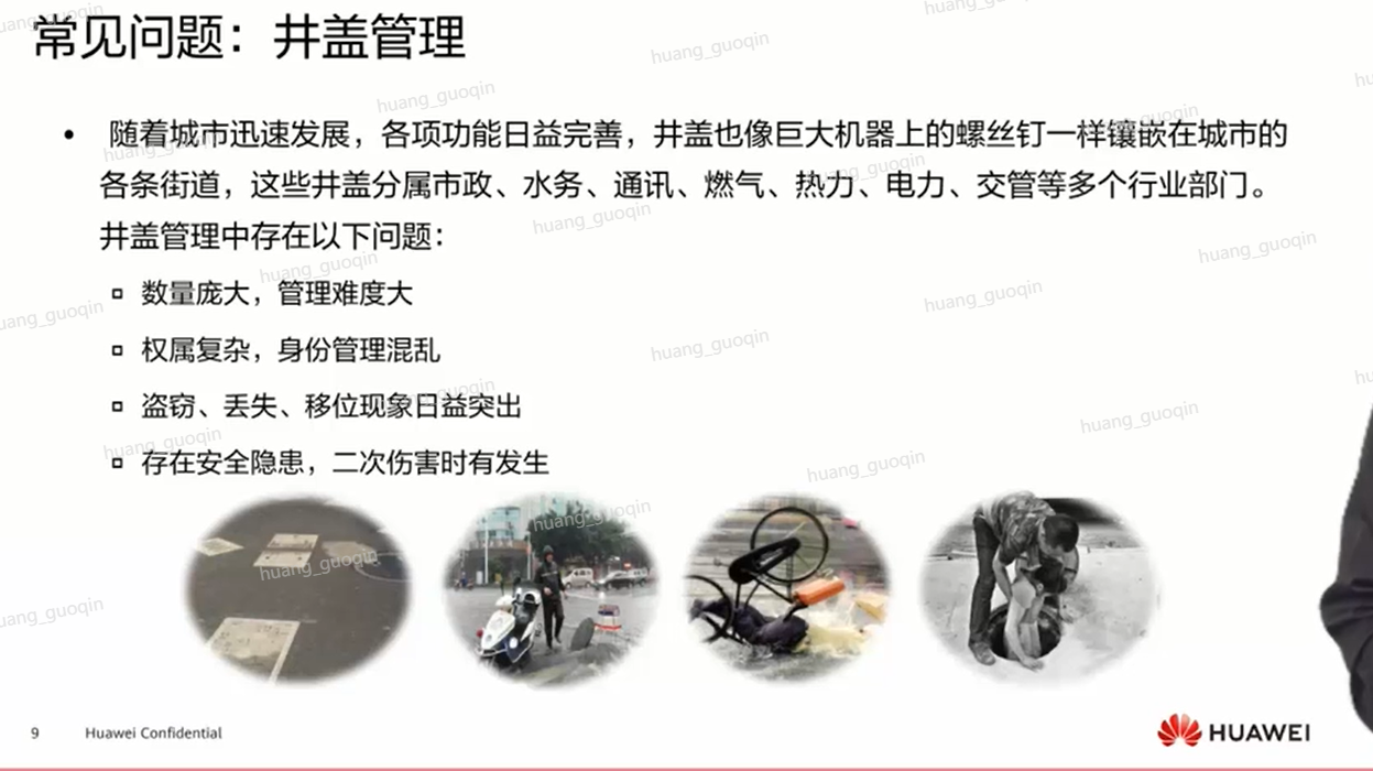 在城市当中还有一个比较明显的就是井盖管理的问题,这也是在城市里特有的一个问题。首先井盖的数量很多,并且这些井盖并不是只属于一个部门的,在上面也可以看到,井盖 分属于市政、水务、通讯、燃气等等各个部门都有,所以因为数量和权属的问题,这些井盖管理起来就非常困难,因为虽然大家在地上看到的都是井盖,但是由于他们属于不同的部门,到底谁去管理这些问题呢?哪个部门去管理这些问题呢?还有就是井盖的数量这么多,到底怎么 去管理呢?这些都是一个问题。还有就是盗窃、丢失的问题,盗窃丢失之后呢,就很有可能人 们在开车或者走路的时候,一不注意就掉进去了,所以就会有这种安全隐患。还有就是像这些 井盖下面都是排污管道,很有可能会存在有毒气体,如果这些井盖丢失的话,很有可能有毒气 体就会向上飘到城市里,进而造成一些不好的后果。所以井盖的管理也是城市中比较重要的一 件事,也是在城市当中需要各个部门共同协调好去处理的一个问题。