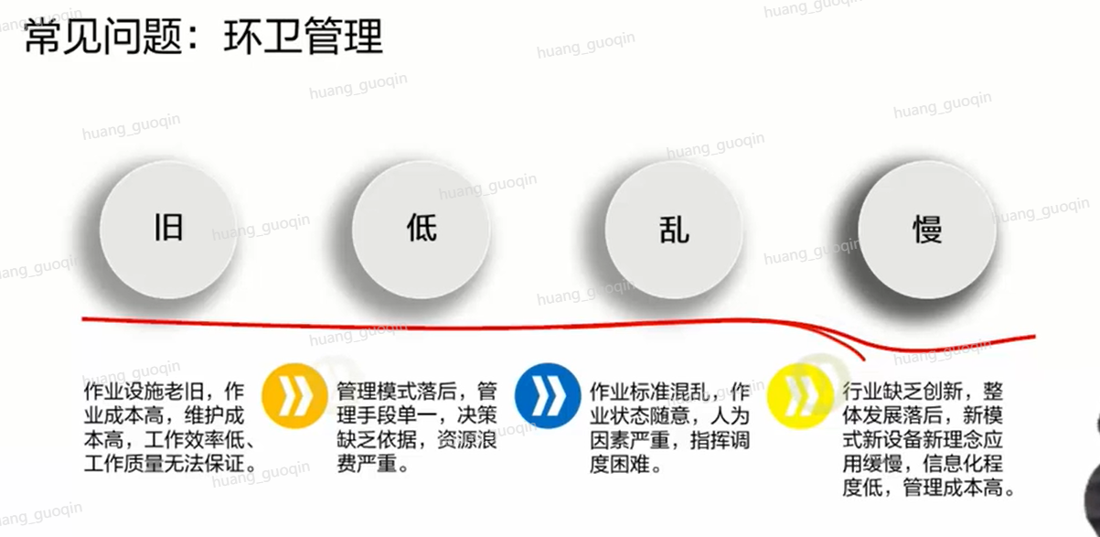 在城市当中还存在环卫管理的问题。在这里大致可以将问题分为旧、低、乱、慢,这四个不同的方面。首先,由于环卫部门目前未对公共垃圾桶信息进行收集,管理方式也是传统的定时清倒。其次由于在环卫这个问题上,基本上都是以人为主的管理方式,所以指挥调度的难度大大增加。同时环卫部门对于新技术的接纳程度并没有那么高,他们还是习惯于使用老的 方式对城市卫生进行管理,所以这个行业就会存在缺乏创新,发展缓慢的问题。