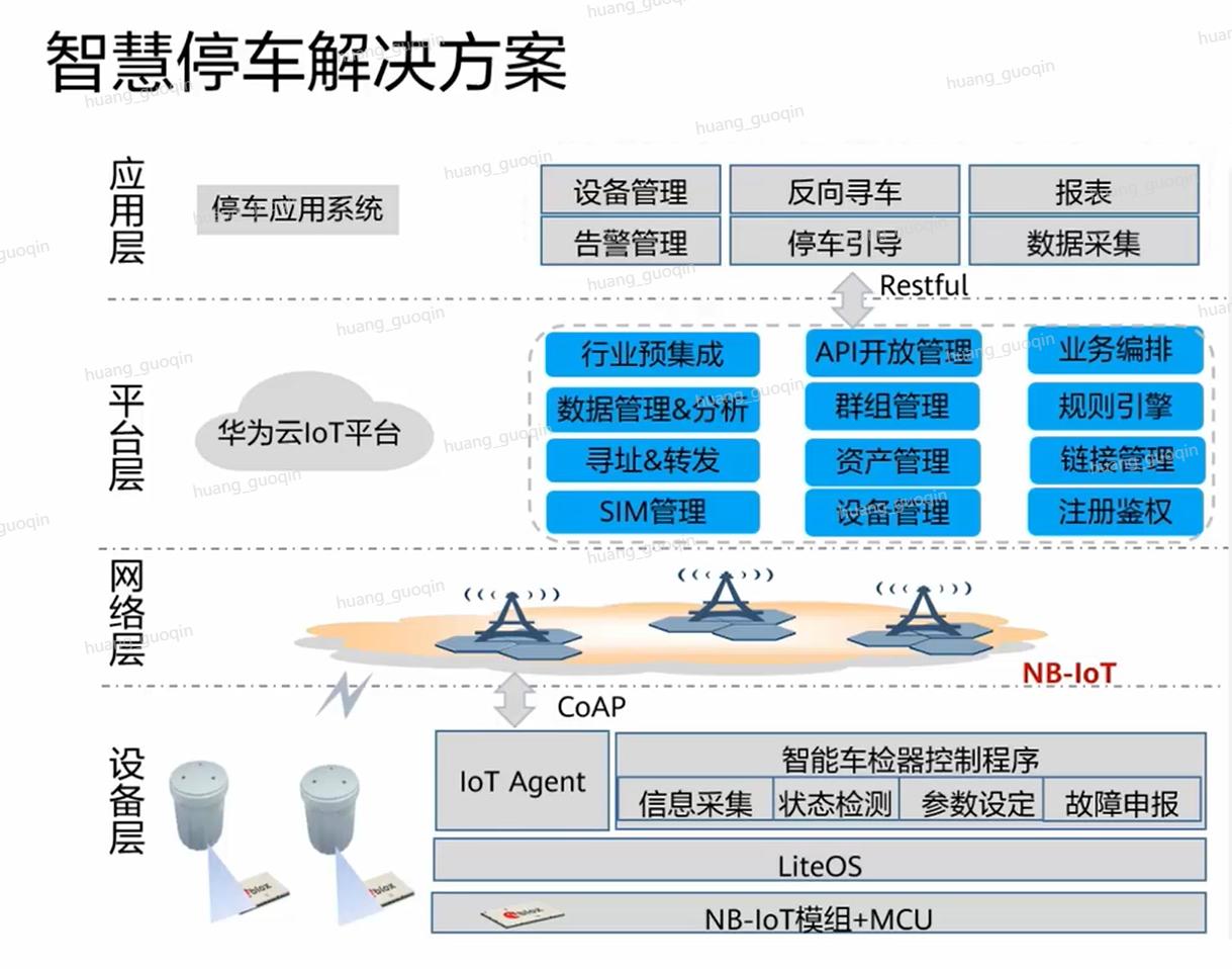 网络层:使用NB-IoT广覆盖、大连接、网络架构简化等特性,可以满足停车分布离散的特点,降低运营商安装及维护成本。
