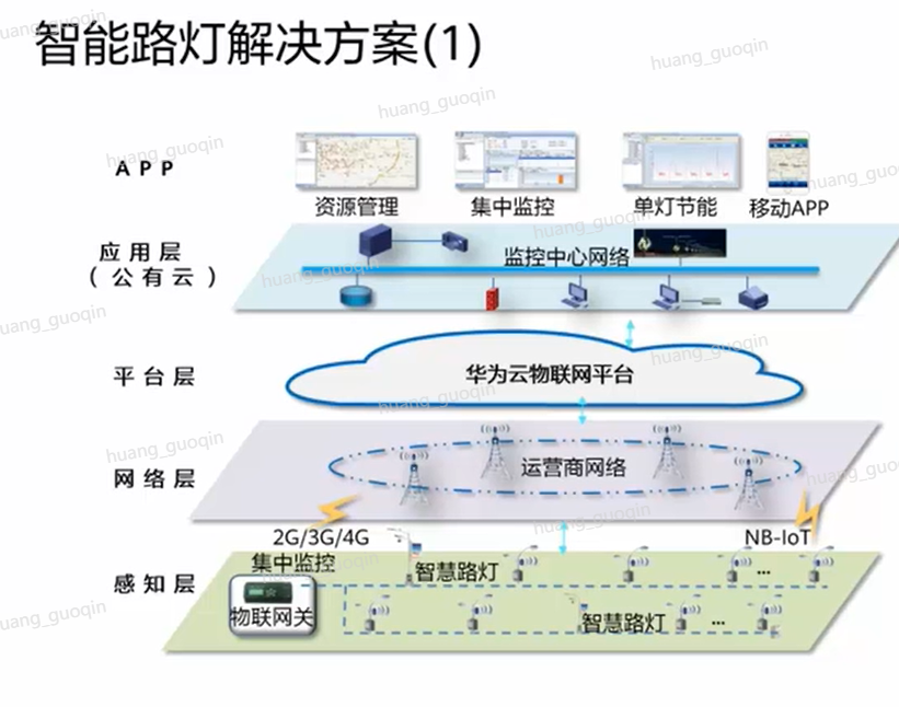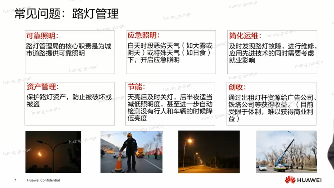 接下来把目光转向路上,也就是路灯方面的问题。现在城市里大部分的路灯,还是会用时间来控制灯的亮灭,例如在傍晚的时候到了一定的时间点,天色快暗了,市政部门就把路灯打开。 等到早上某个时间点再把灯关掉。这样就存在一个问题,一年里面不同的时候昼夜时长是不一 样的。夏天的时候天黑会稍微晚一点,冬天的时候天黑会稍微早一点。那么对于用时间控制的 路灯就很容易造成电的浪费。 还有一些特殊情况,比如日食的时候,光照会严重不足,如果路灯是靠时间来进行控制的话,此时路灯就不能起到一个应急开灯的效果。除此之外,当下路灯排障也存在不便,现在检修基 本上都是在白天,而白天不开路灯的时候,维修人员就需要一盏一盏地检查过去,非常的费时 费力。而且如果维护人员没有按时检修,就有可能出现夜间照度不足,存在安全隐患。所以如果能有一种技术能够实时监控每盏路灯的运作情况,并且在路灯故障的时候及时的反馈这样一个出错的信息,对于维修人员来讲就会更加方便。 还有就是节能的问题,晚上开灯的时候,前半夜行人车辆较多,但是到了后半夜,路上并没有什么车,如果路灯仍旧100%功率照明,就很容易造成资源的浪费。这个时候就需要有一个相对比较智能的系统,自动去检测路上有没有行人或者是车辆,然后适当地去调整路灯的亮度。 还有一个问题就是灯杆资源的收益问题,其实大家可以看到,如今电线杆现在已经不常见了。 这就使得路灯杆成为城市里稀缺的杆位资源,比方说公安系统可以在路灯杆上装监控摄像头, 运营商也可以部署 5G 基站等等,同时电网公司可以在路灯杆下面装上新能源汽车的充电桩。 这样可以把杆位资源的利用率达到最大化。以上描述的这些就是在路灯这个问题上可能遇到的 问题。