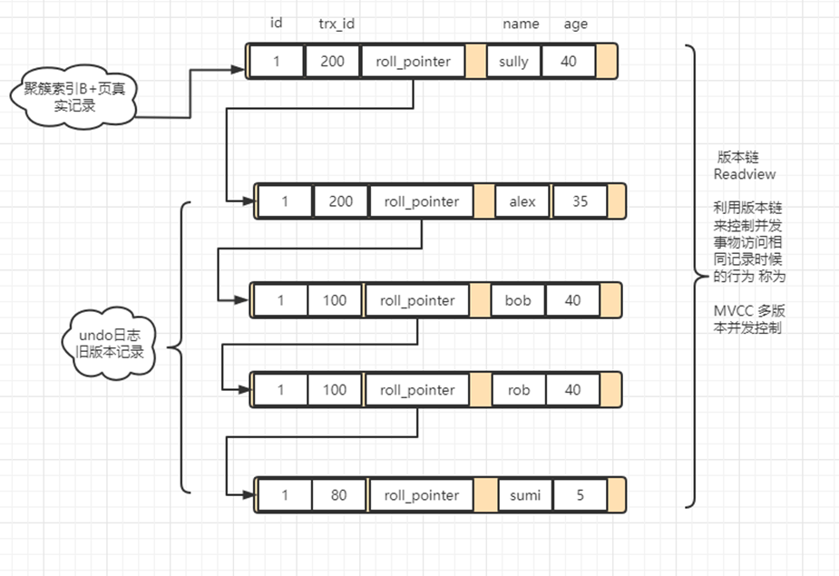 | 执行查询SQL 生成readview : 未提交事物ID数组(数组里最小id为 min_id) 和已经创建的最大事物id (max_id)组成例 [100,200] 300 版本链对比 a) trx_id 在数组中,说明未提交: 不可见 注:删除的情况 -> 特殊的update,会将版本链最新数据复制一份,将trx_id 修改成删除操作的trx_id,同时将该条记录的头信息(record header)里面的(delete flag) |