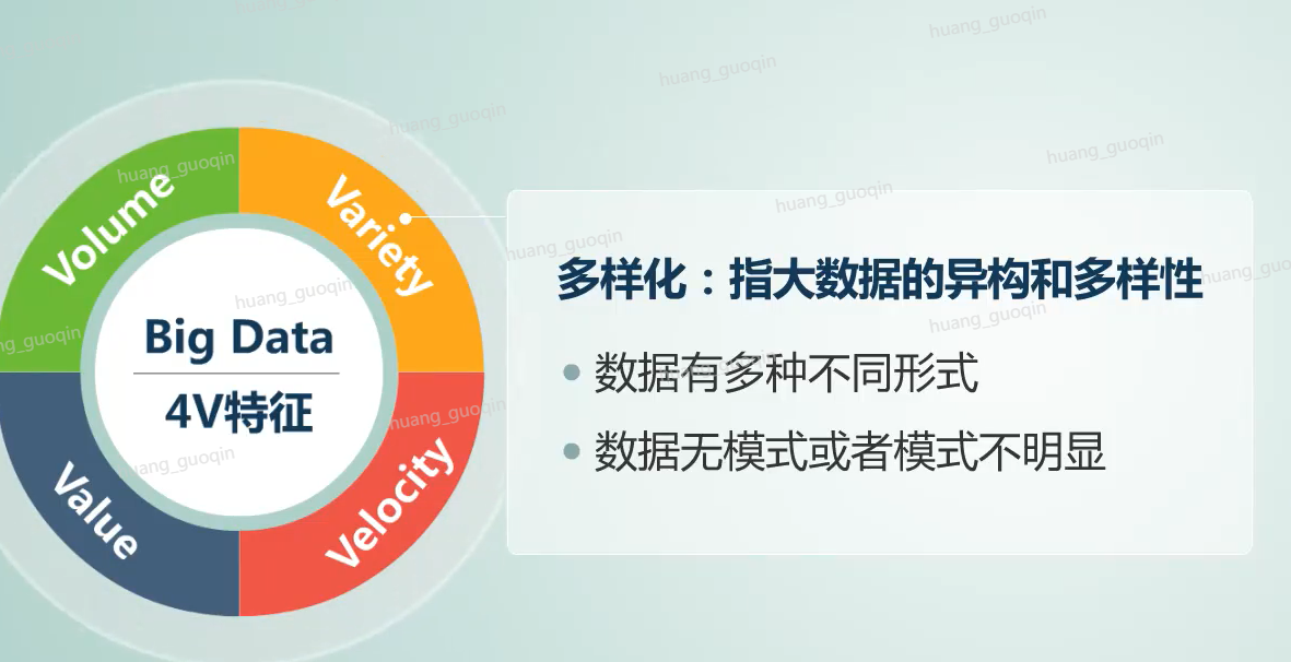 数据有很多不同的形式,比如文本、图像、视频、机器、数据等等,这些数据呢大多是无模式或者是模式不明显。