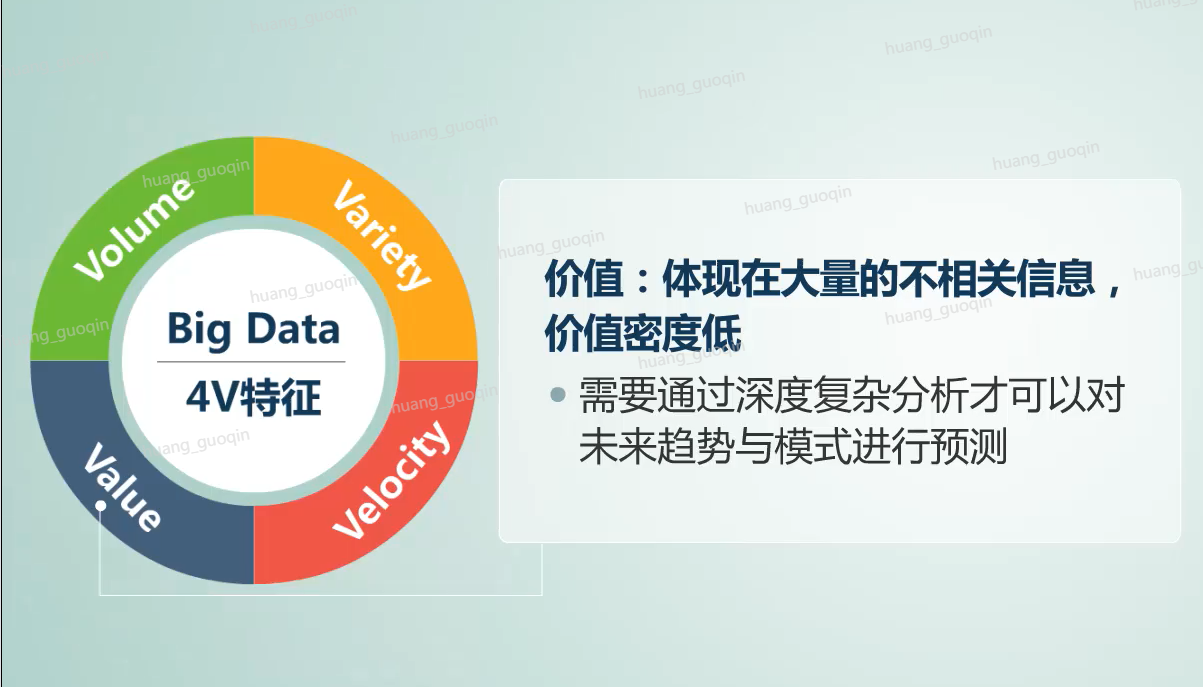 第三个位置的是value价值,主要体现在大量的不相关信息,价值密度低,需要通过深度复杂分析才可以对未来的趋势和模式进行预测。