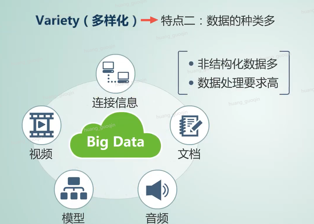 第二、数据的种类多。保存在关系型数据库中的结构化数据其实只占少数,而百分之八十到百分之九十的数据是诸如图片、音频、视频、模型、连接、信息、文档等等一些非结构化和。半结构化数据。那么相对以往便于存储的、以文本为主的结构化数据而言呢,这些非结构化数据越来越多,同时这些多类型的数据对数据的处理能力也提出了更高的要求。