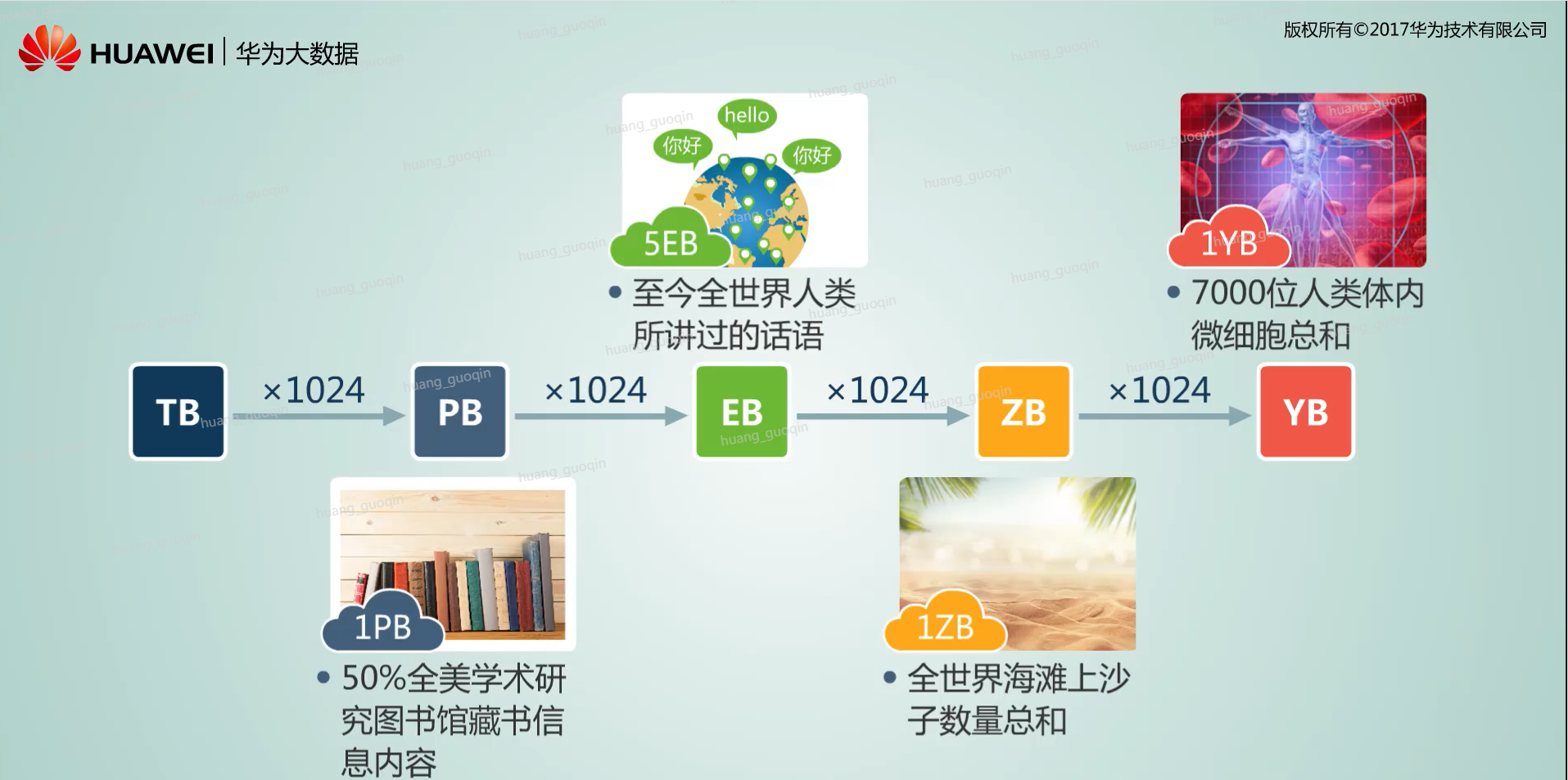 这是什么概念呢?我们来看一下容量单位的一些形象示例。比如一个PB等于1024的TB,相当于百分之五十的全美学术研究图书馆藏书的内容总和,一个EB等于1024个PB,那五个硬币就相当于至今全世界人类所讲过的所有话语。一个ZB等于1024个EB,如同全世界海滩上的沙子的数量总和。一个YB等于1024个ZB相当于7000位人类体内的细胞数的总和。可见呢大数据的数据量确实是海量的。