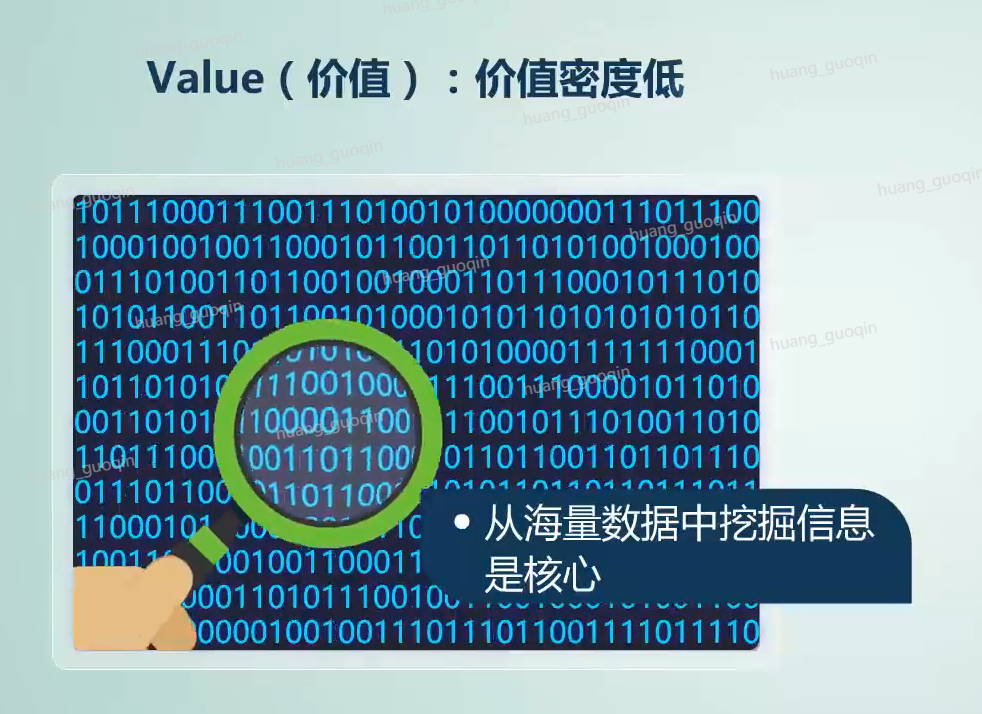 第三个value价值,对于大数据本身而言,它的价值密度低,这是它的典型特征。而如何去挖掘大数据的潜藏价值,像沙粒淘金一样,从海量数据中挖掘稀有并且珍贵的信息才是大数据的核心。