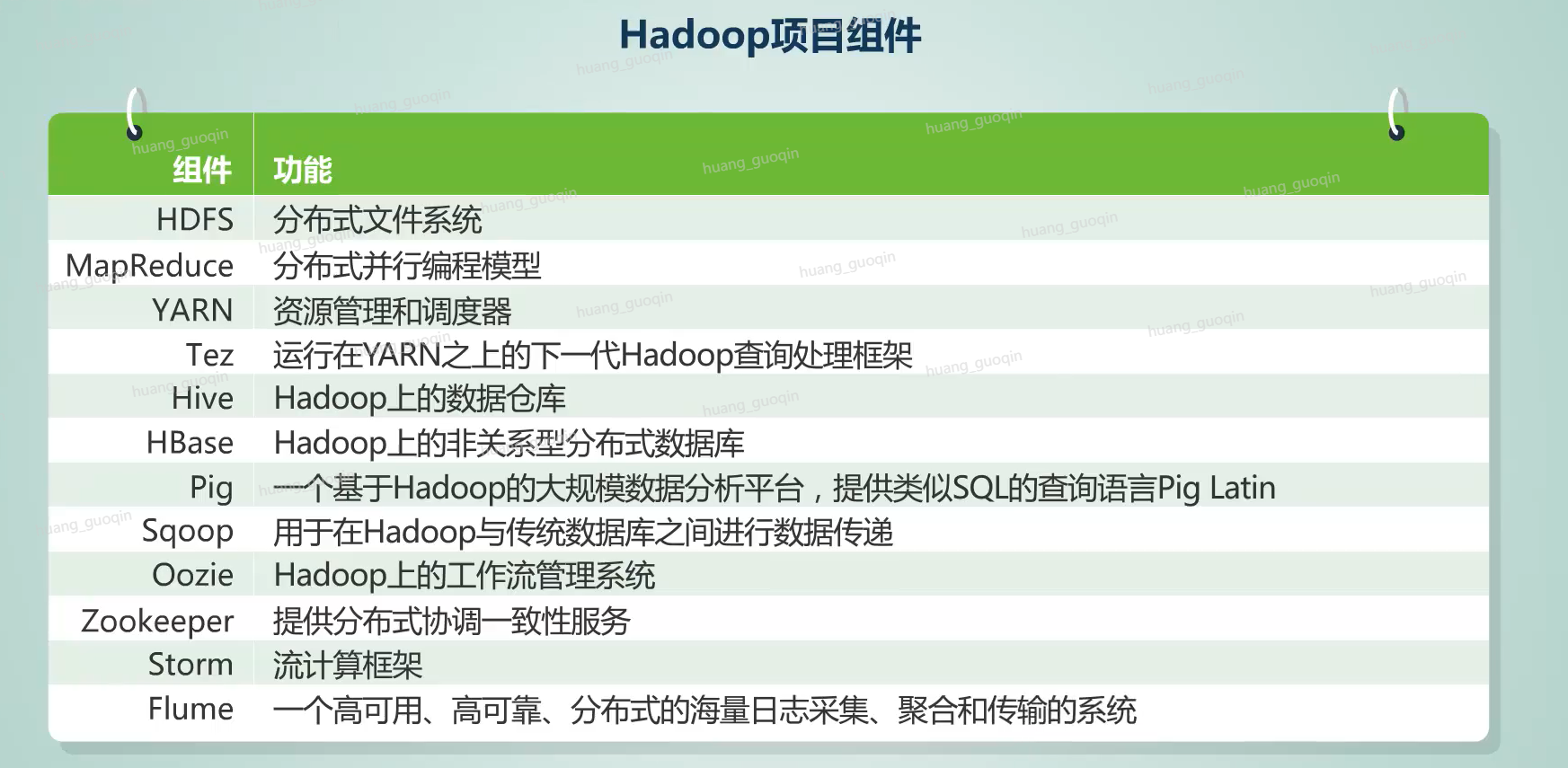 hadoop里包含了许多项目,比如HDFS是hadoop的分布式文件系统,MapReduce是分布式并行编程模型。YARN是资源管理和调度器。TeZ运行在YARN之上的下一代hadoop查询处理框架。Hive是hadoop上的数据仓库,HBase是hadoop上的非关系型分布式数据库。pig是基于hadoop的大规模数据分析平台,提供类似于sql的查询语言Pig Latin。Sqoop用于hadoop与传统数据库之间进行数据传递。Oozie是hadoop上的工作流管理系统,zookeeper提供了分布式协调一致性服务,storm是流计算框架,Flume是一个高可用、高可靠、分布式的海量日志采集、聚合和传输的系统。以上呢就是Hadoop系统的主要项目组件。
