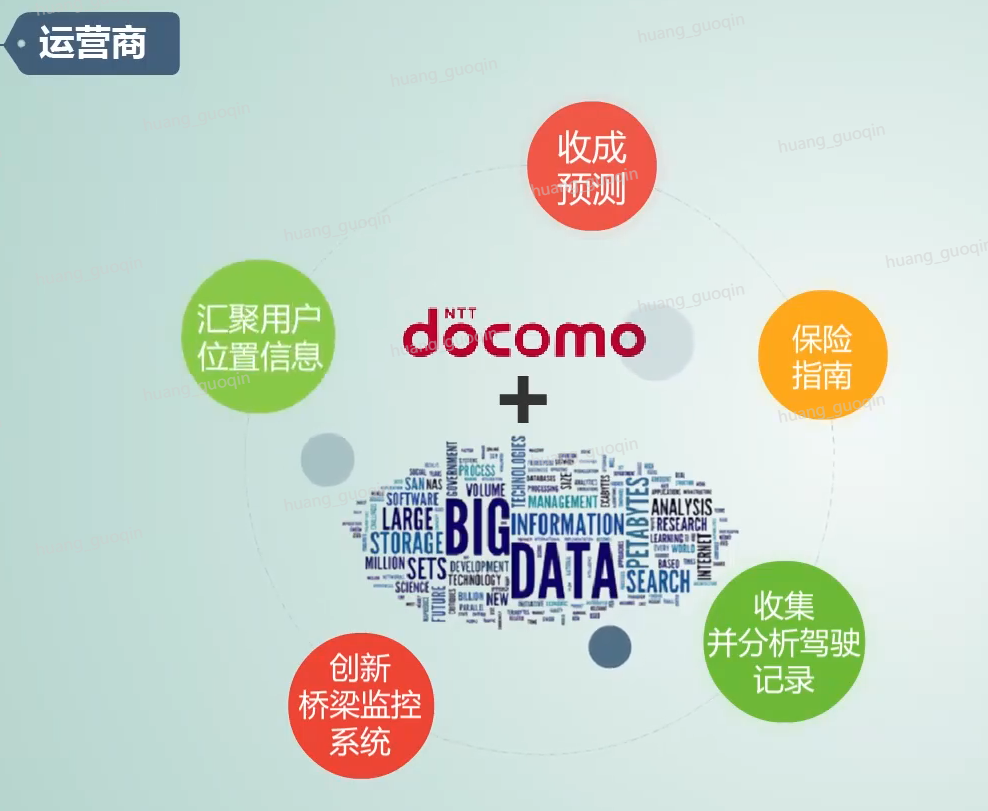 在运营商领域,docomo公司通过撬动大数据,努力开发新的商业机会,提取公司海量的客户信息,实现了8个产业110亿美元的收入。比如基于作物品种和天气的作物种植和收成预测、基于客户位置和行为信息的保险指南,为保险和汽车行业收集并分析驾驶记录,通过实时监控传感器状态、汽车速度、风向、风速等的创新桥梁监控系统,为旅游资源开发汇聚用户的位置信息。