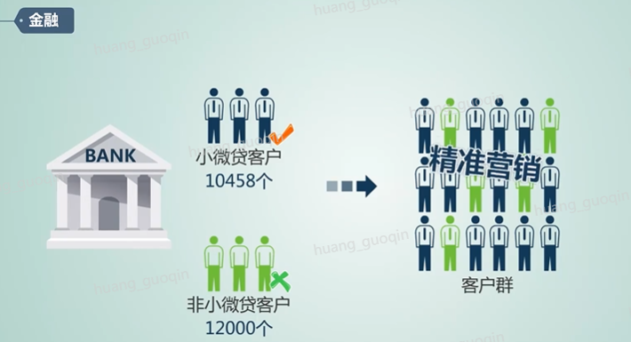 再比如某银行通过将小微贷客户和非小微贷客户的特征收集,建立小微贷倾向预测模型,其中收集小微贷客户信息10458个,非小微的客户信息1200个,然后将900客户数据执行分析,挖掘出一万四千个客户特征,从而来获取高倾向小微带客户列表,并将前一万名高倾向小微贷客户列表分发给各分行业务部门进行重点营销,最后的执行效果显著,业务的转化率比原有的专业系统提升了二十五倍。