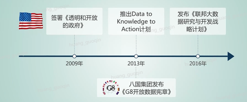 而在国家层面上,各国已经将大数据作为国家战略提上了议程。2009年,美国总统奥巴马签署了《透明和开放的政府》。2013年,白宫推出了Data to Knowledge to action计划,这是美国向数字治国、数字经济、数字城市、数字国防转型的一个重要举措。美国政府2016年5月发布了《联邦大数据研究和开发战略计划》,围绕了人类、科学、数据共享、隐私、安全等七个关键领域,部署推进大数据的建设。另外有八国集团在2013年联合发布了G八开放数据宪章,提出要加快推动数据开放和利用。