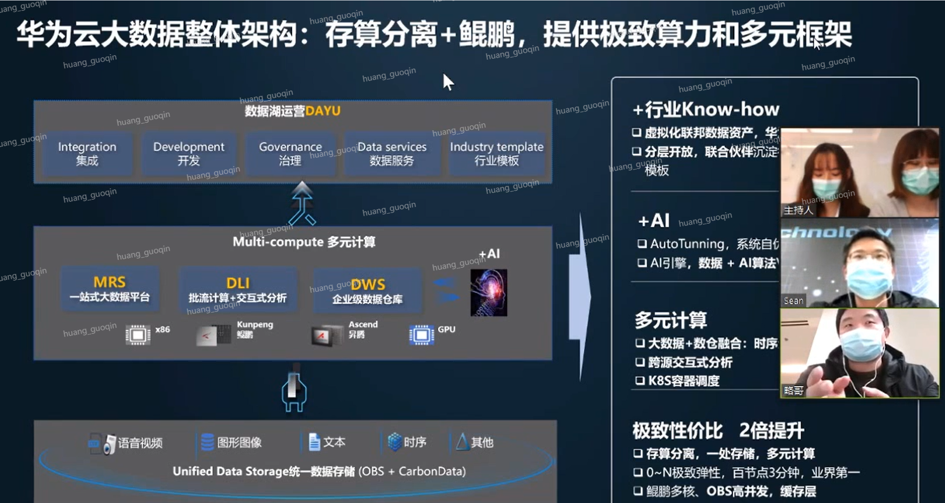 我们华为云的大数据整体架构可能总结现在可能就是这个存算分离加鲲鹏,总结一句话就是这个存算分离加鲲鹏,它代表什么意思呢?