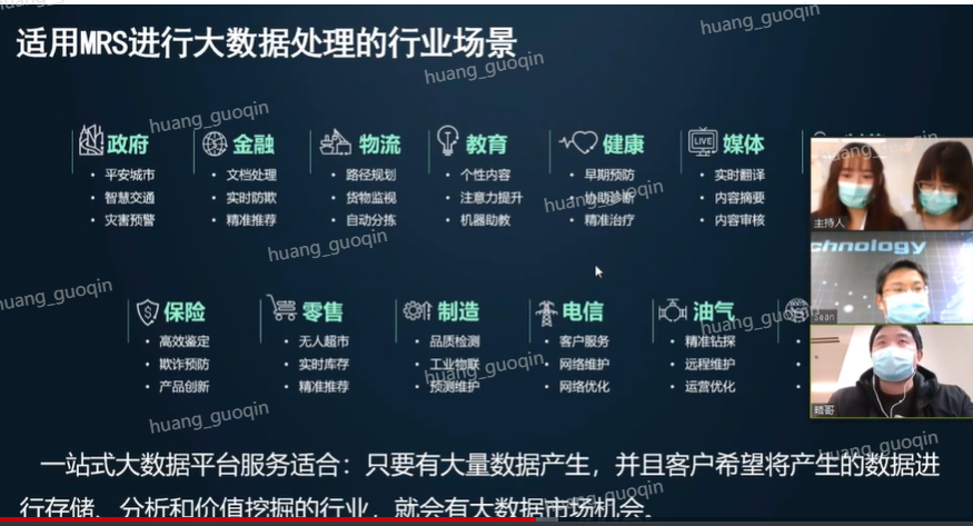 在生态方面,我们的大数据平台是百分之百跟开源接口进行兼容的,开源生态里面能够接入的那些工具、软件或者服务,在我们的华云平台的大数据服务上面都可以都可以继承过来或者都可以接入过来,方便用户能够比较方便或者比较灵活的把我们的大数据平台迁移到华为云上面来。这是我们自己梳理了一下,我们的大数据平台或者我们的MRS服务比较适用的这些场景。但现在我们看到这个一站式的大数据平台,它只要满足一个条件就基本上比较实用,就是我们做的只要能够产生大量的数据,而且这个数据可能占TB级别或者更大的这个重量维度来来看的话,超过了TB,几十TB、上百TB或者TB级别的话,那么他们一般来说这些行业不得不使用这种大数据平台来对我们的数据进行一些清晰转换的话,能够出一些汇总统计。同时还有一部分用户可能会将来做一些类似用户画像、精准营销等等这方面的操作,来为我们的业务产生更多的价值。数据能够通过大数据平台产生价值,为上层的业务服务。