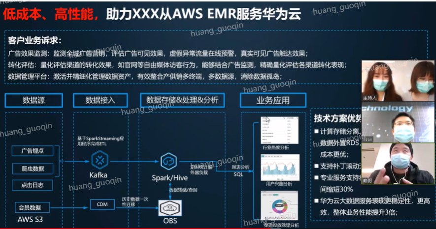 同时我们可能提供了第二种选择,这种选择可能会更加高效,同时更加高性价比,就是我们的鲲鹏生态,我们基于我们这种鲲鹏芯片的这种大数据服务,可能相比这种传统的及X86的这种大数据服务,在性能上面,我们的价格可能会低个百分之三十,现在华为的所有的大数据产品,包括我们的什么大数据平台,或者我们的企业级的数据仓库,都是可以在我们鲲鹏上来良好的、运来完整的或者良好来进行运行的。这样从芯片本身,我们可能为我们的客户会带来不小的这种性价比的收益。
